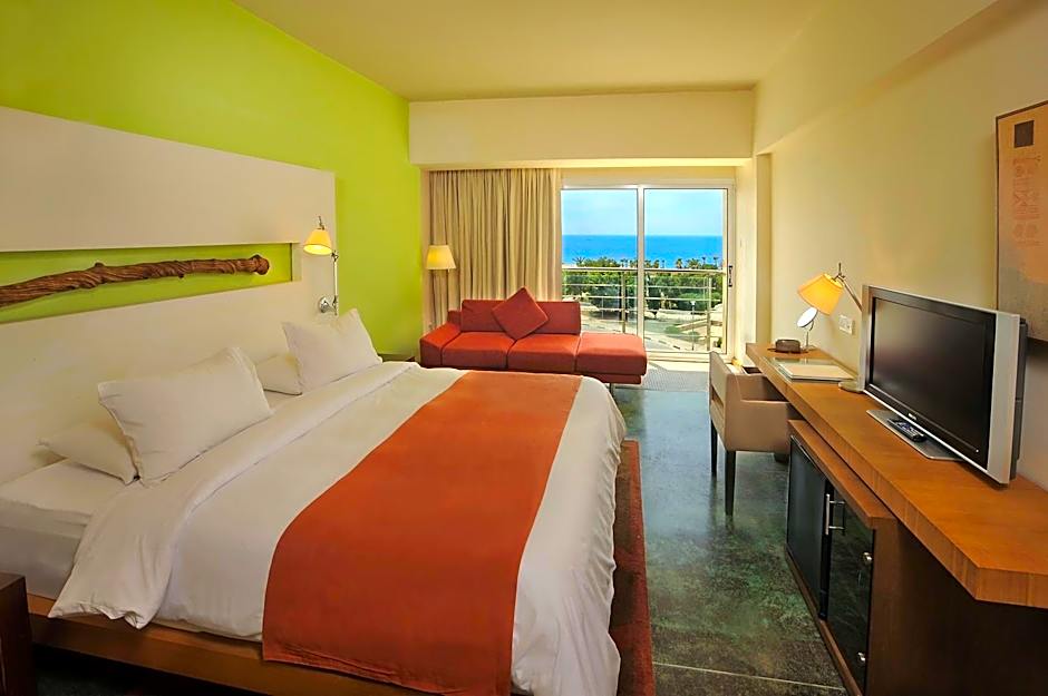 Elegant room with seating area and balcony with side sea view.